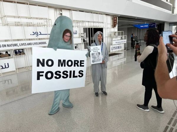 12月4日下午,COP28会场里反对化石能源的抗议人士。摄影/韩舒淋