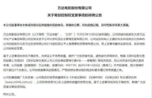 12月6日,万达电影(SZ002739,股价12.45元,市值271亿元)发布公告称,公司间接控股股东北京万达文化产业集团有限公司及其全资子公司北京珩润企业管理发展有限公司、公司实际控制人王健林拟将其合计持有的公司控股股东北京万达投资有限公司(以下简称“万达投资”)51%股权转让予上海儒意投资管理有限公司(以下简称“上海儒意投资”)。若相关事项最终实施完成,将会导致公司控制权变更。