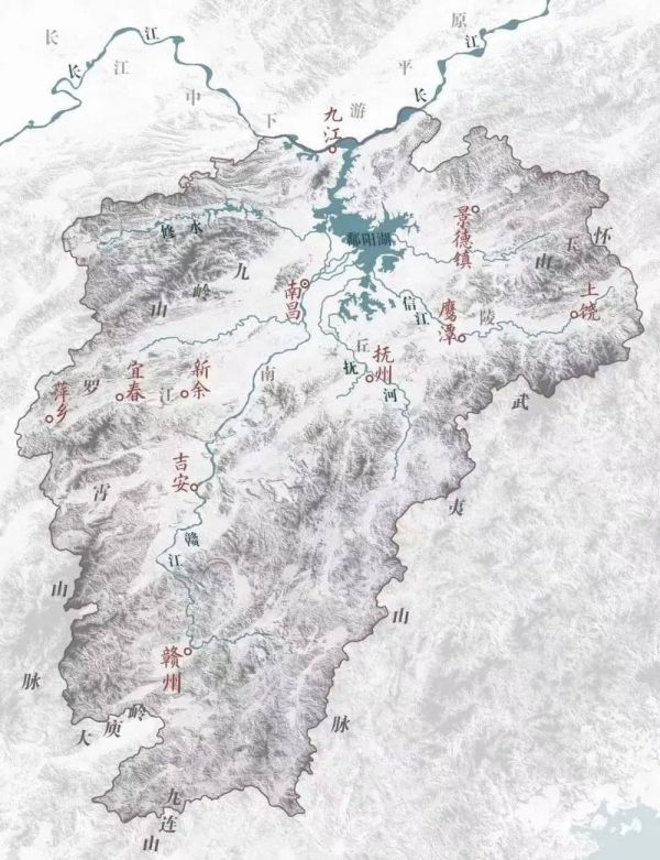 这要从江西特殊的地形说起,虽与六省接壤,但江西北接长江,其余三面都是山地,与外界有着天然的地理区隔,对外交通并不方便。在地形图上看,江西和湖南的省界是南北走向的罗霄山脉,与福建的边界也是同样走向的武夷山脉,此外还有大庾岭、幕阜山、九岭山和九连山脉等诸多山脉也紧紧包裹着江西。