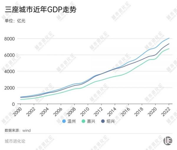 温州身后,绍兴正在努力追赶。Wind数据显示,2020年,绍兴与温州之间的GDP差距一度拉大到869.9亿元,到2022年已缩小至678.8亿元;而绍兴对嘉兴的领先优势,也在多年逐步走低之后,去年画风“突变”,拉大到超600亿元。