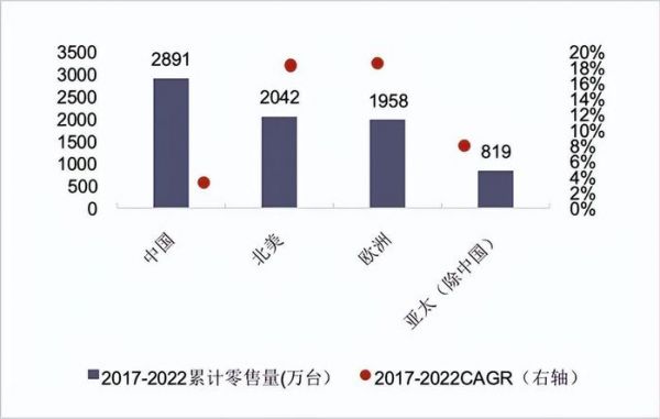 尤其是居民收入和消费力较强的欧美,近年来的销量复合增速明显高出国内一大截。2017-2022年,国内销量复合增速仅有3%,但北美和欧洲的增速高达18%和19%。