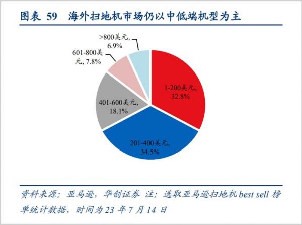 虽然扫地机器人在海外起步较早,但产品以中低端为主。亚马逊平台扫地机品类榜单前100名中售价在400美元以下的产品占比接近七成,800美金以上的不到7%。
