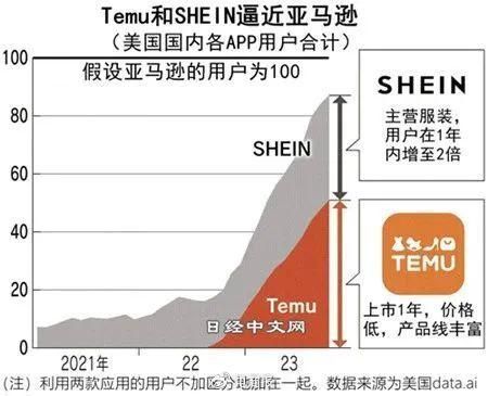 其中,增长最快的是美国市场。数据显示,Temu和SHEIN的美国用户数量在全球总用户数量中所占的比例分别为41%和18%,均超过亚马逊的15%。