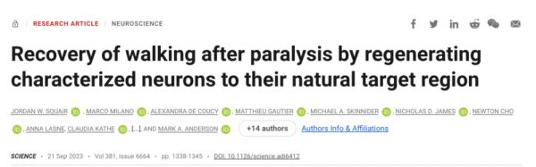 [1]Squair, J. W. et al. Recovery of walking after paralysis by regenerating characterized neurons to their natural target region. Science 381, 1338-1345, doi:10.1126/science.adi6412 (2023).