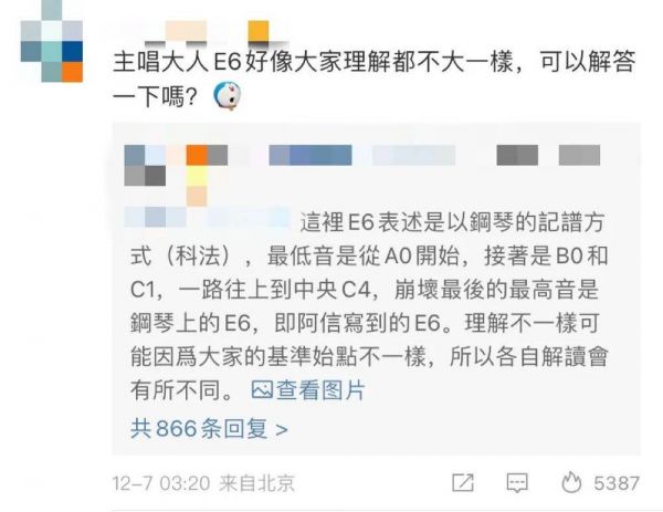 范筒:简单粗暴地说,E6大概是一个擅长唱高音的女性、或者极少数天赋异禀的男性才能唱到的位置,很多博主也转发了萨顶顶、迪玛希的唱歌片段,他们那个音都已经有点像挤出来、非自然存在的一个高音了,到那个程度,音质就比较难保障了。