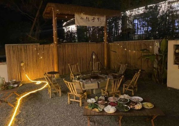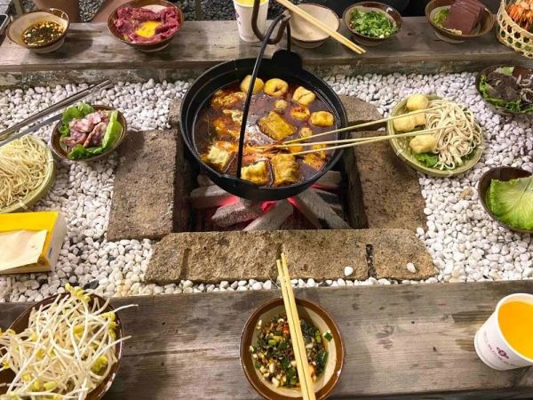 进阶版的吊炉火锅就不同了,大多用石块或者红砖,围搭成火塘的形式。锅也实实在在地用麻绳吊了起来,一般用原木搭建成三角支撑架。涮火锅用的食材就近放置在火塘四周的石块上,主打一个自在、野趣。