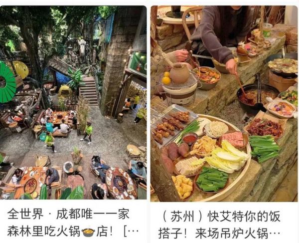 露营地、茶院就不必说了,火锅店造的景同样各式各样:有门店主打老厂房市井风;有门店则在店内打造了丛林,营造出绿野仙踪的氛围;也有门店主打新中式风格的小院,庭院内流觞曲水,好不雅致。