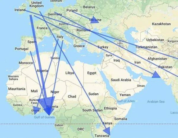 欧洲电子垃圾的全球流通。图片来自巴塞尔行动网络的报告