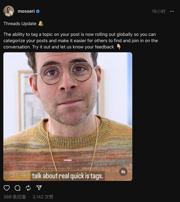 ▲ 图源 mosseri 发布的贴子IT之家获悉,目前用户可以最多在自己的帖子中创建一个 hashtag 标签,Meta 声称此举是为了避免垃圾信息。