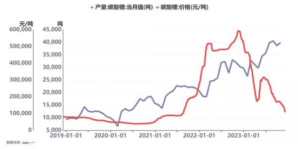 在此背景下,2021年以前价格长期徘徊在10万元/吨之下的碳酸锂,亦开始走出井喷行情:从2020年7月份的约4万元/吨起步,一路涨至2022年11月的近60万元/吨,在短短两年多的时间里涨幅高达15倍;其后便迎来了一轮暴跌行情。从时间跨度上看,碳酸锂价格牛市的启动和结束,均晚于消费量半年左右。