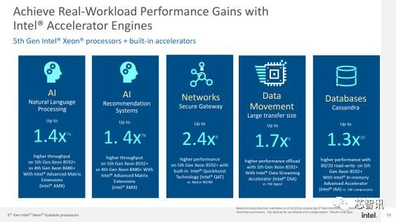 第五代 Xeon“Emerald Rapids”CPU 中嵌入的加速器引擎提供最新的 AMX(高级矩阵扩展),并由一套利用优化的开源框架和工具的可靠 AI 软件套件提供支持。英特尔还声称,与第四代至强相比,第五代至强芯片将提供更高的 TCO 和性能/价格收益,同时为客户提供直接升级路径,因为 CPU 与第四代 SKU 共享相同的插槽和平台。