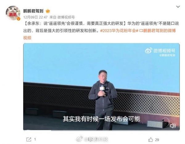 【华为#余承东谈遥遥领先#:非常不容易,需要研发创新和强大技术投入】据 @鹏鹏君驾到 ,华为常务董事、终端 BG CEO、智能汽车解决方案 BU 董事长余承东日前在 2023 华为花粉年会现场讲述了“遥遥领先”背后的故事。余承东表示,大家把他过去十几年中,在发布会上说过的“遥遥领先”剪到一起编成段子,但实际上只有“领先比较多”的时候,才会说在“这个领域遥遥领先”。