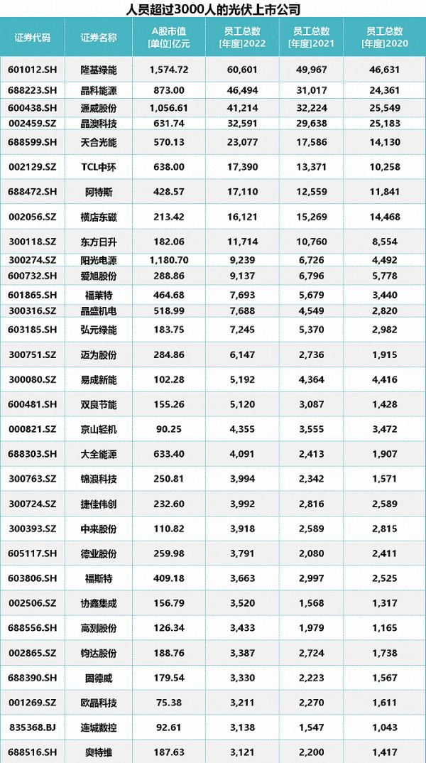 通威股份(600438.SH)被传对此前招聘的人员进行裁撤。作为光伏巨头之一,2020年、2021年和2022年通威股份人员亦是激增,人员规模分别为2.55万人、3.22万人和4.12万人。