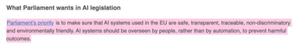 根据官网介绍,欧洲议会推行AI监管的首要任务是确保欧盟使用的人工智能系统安全、透明、可追溯、非歧视和环境友好;人工智能系统应该由人而不是自动化来监督,以防止产生有害结果。