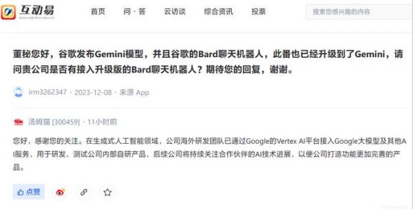 金科汤姆猫 12 月 10 日在“深交所互动易”平台表示,公司海外研发团队已通过谷歌的 Vertex AI 平台接入谷歌大模型及其他 AI 服务,用于研发、测试公司内部自研产品,后续公司将持续关注合作伙伴的 AI 技术进展,以便公司打造功能更加完善的产品。