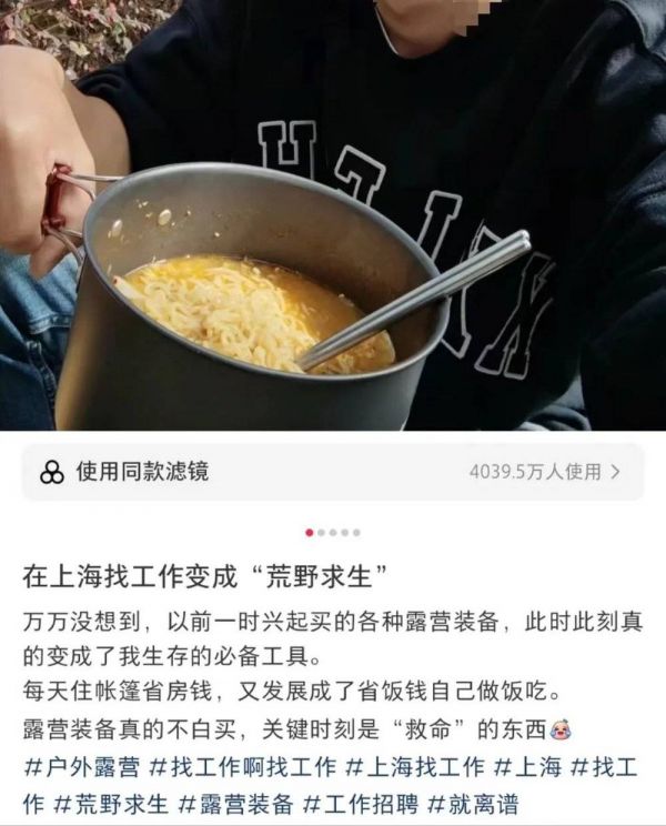 我想起今年10月从青岛开着车来上海寻觅工作的扎克,每天投几十个简历都石沉大海,有一天他突发奇想,不再住酒店,直接把车里的露营装备用起来,省下房租,直到找到稳定的工作。他自己调侃,“找工作变成了荒野求生”,之前用来玩耍的露营装备,竟然真的成了生存用品,每天他给自己做一杯咖啡,再用小炉子做一个简单的炒菜。