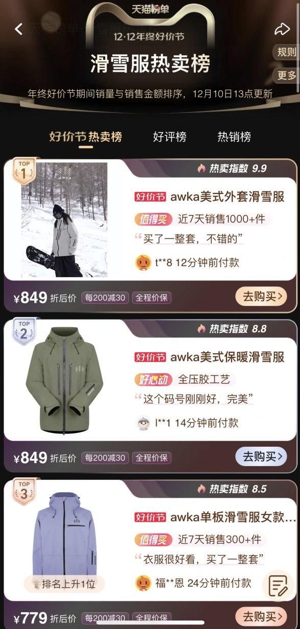 在滑雪热的加持下,部分国产品牌的滑雪服成为近期爆卖的货品:主打性价比的滑雪品牌AWKA蝉联天猫滑雪服热销榜榜首长达6周;时尚户外用品品牌VECTOR部分高客单价的双板滑雪服在双11期间的销售量迅速突破千单;而VECTOR的滑雪用品姊妹品牌VECVEC今年第一次参与双11,就以210%的增速超量达成KPI;羽绒服品牌雪中飞也推出了“高峰滑雪系列”,打造“年轻人的首套滑雪服”。
