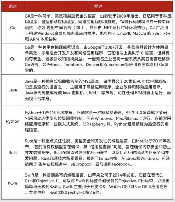 当然,即便厂商已经投入大量心力避免漏洞,但结果依然不容乐观,而这正是CISA、NSA、FBI反驳使用C/C++的根本原因,而报告中,则推荐了C#、Rust、Go、Java、Python和Swift等几个编程语言。