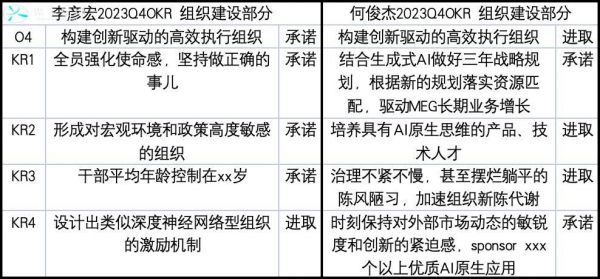 何俊杰OKR的对齐情况表明MEG的组织建设动作要激进得多,有一个进取型的O与两个进取型的KR。