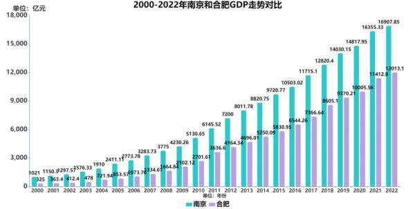 2000-2022年南京和合肥GDP走势对比
