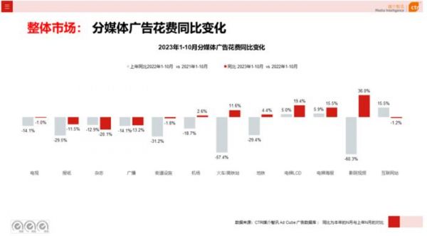 CTR(央视市场研究)媒介智讯的数据显示,2023年1-10月广告市场同比上涨5.6%,10月份广告市场花费同比上涨6.6%,其中线下广告市场增长更为强势,线上增速不明显。其中1-10月影院视频、电梯LCD、电梯海报、火车/高铁站广告花费同比增长超过两位数,分别为36%、19.4%、15.5%和11.6%。不难发现:线下,特别是线下的大屏与视频类广告在增长。