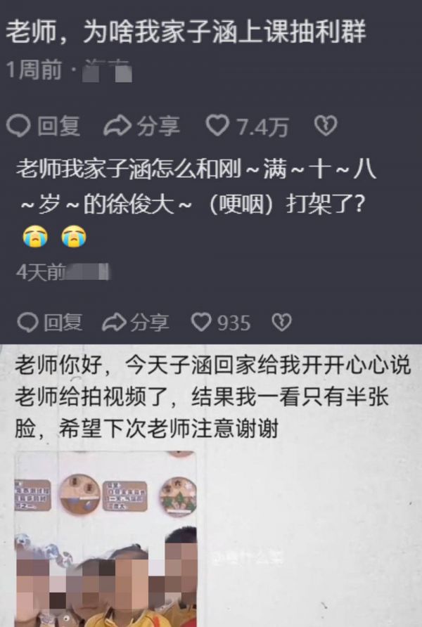 于是,家长群变成了冲突的前线。礼貌措辞、无奈解释的老师受到了同情,与此同时,“卑微”发言的家长们的处境也曾引发大规模的讨论。当对孩子的爱单单指向对老师的希冀和质疑时,家长对孩子的关怀似乎逐步在错位。这样的错位也引发了大规模的共鸣,让网友模仿“子涵”妈妈的发言成为一种热潮。