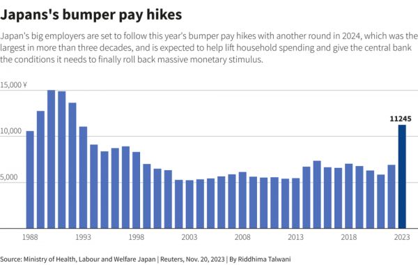 日本大企业们准备在 2024 年延续过去三十年来最大的加薪,旨在提高家庭支出和给予央行重新考虑货币政策的理由。