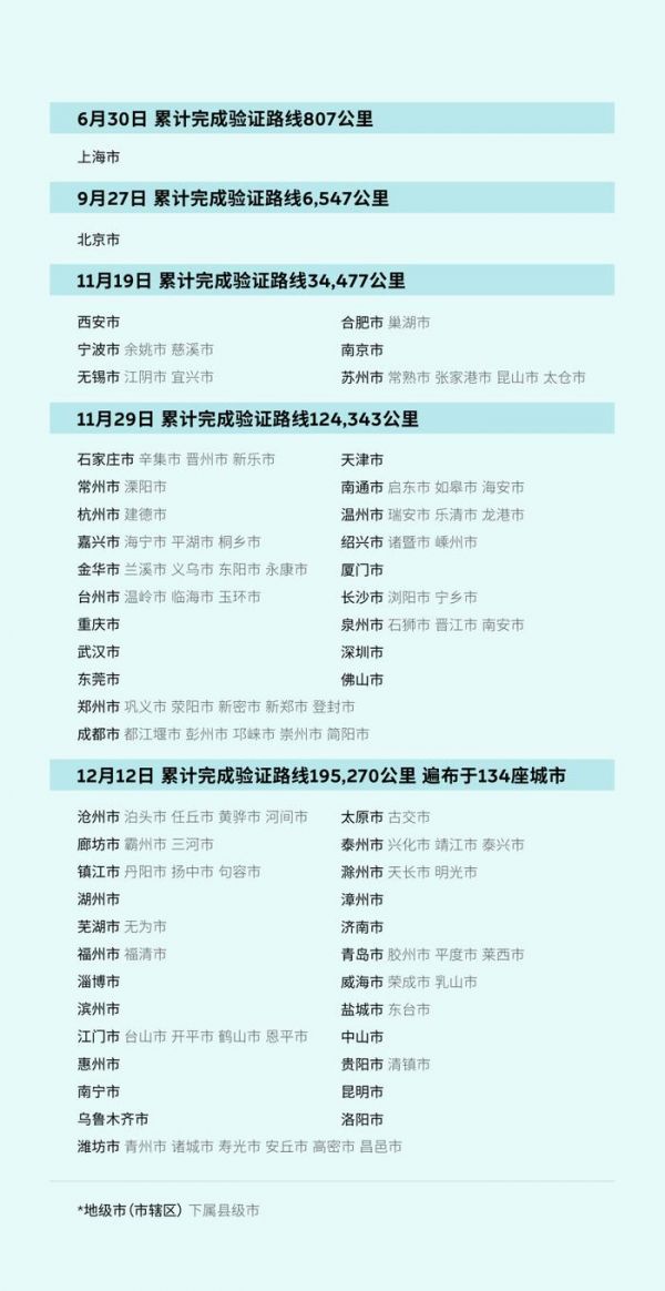 截至 12 月 12 日零时,累计验证路线 195,270 公里,遍布于 134 座城市。