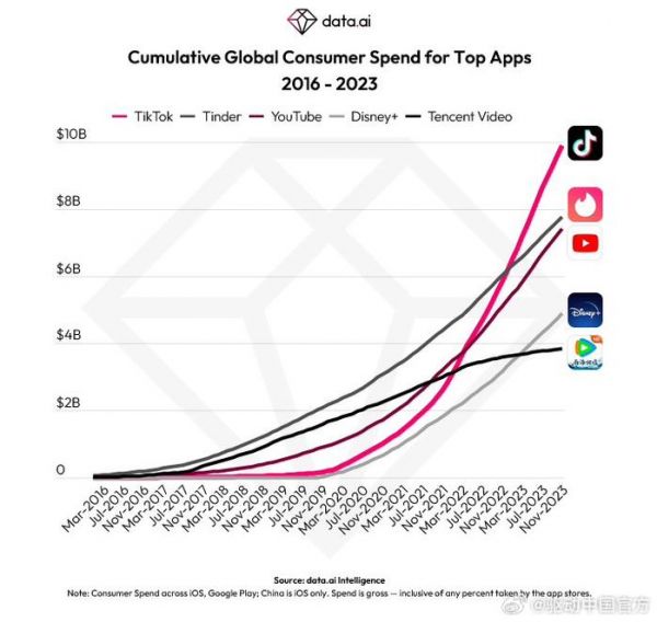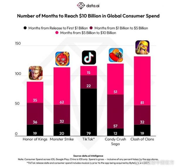 12月12日消息,根据应用分析机构 Data.ai 公布的最新报告,抖音(包括海外版 TikTok)成为全球第 5 款消费者支出突破 100 亿美元的应用(含游戏),也是唯一一款进入“100 亿美元俱乐部”的非游戏应用。根据报告显示,TikTok 今年交易额为 38 亿美元,相比较去年同期的 33 亿美元,同比增长 15%。TikTok 从上线到交易额 10 亿美元,用时 79 个月;从 10 亿美元达到 50 亿美元,用时 22 个月;从 50 亿美元到 100 亿美元,用时 15 个月时间,达到 100 亿美元用时 116 个月,排名第三。(IT之家)
