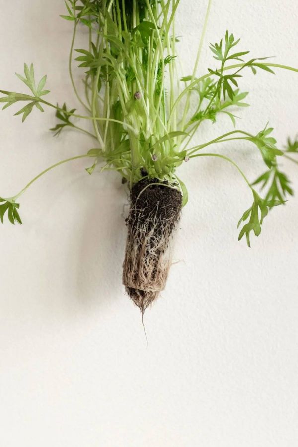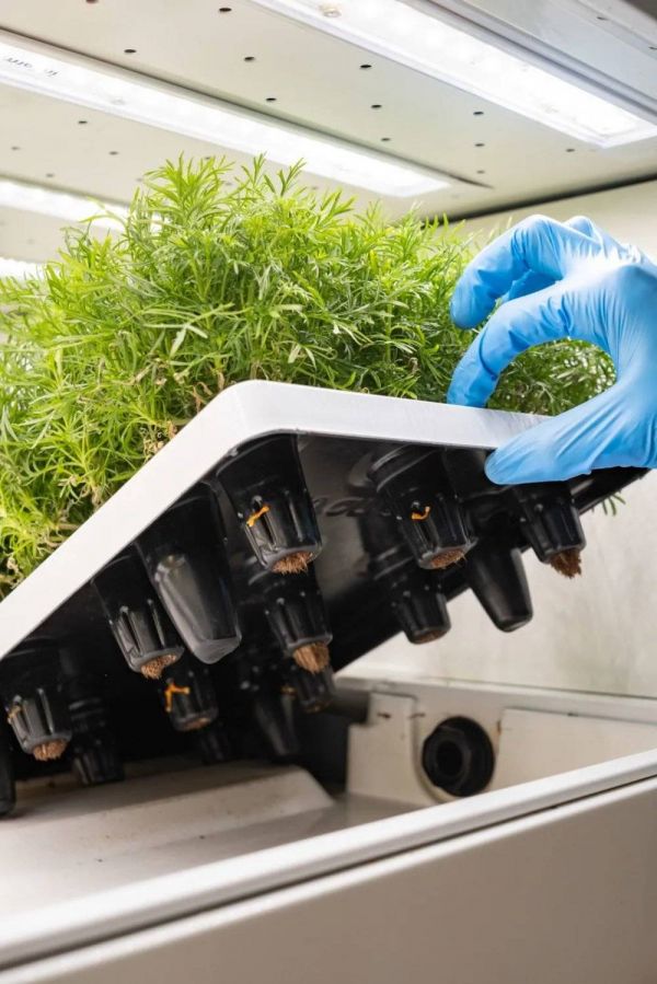 生长柜中的植物根茎处扎连着一根形状规整成柱体状的湿润土质基底(substrate),被细细的根须缠绕篡紧。