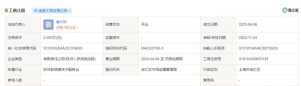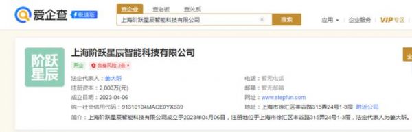 根据爱企查信息显示,阶跃星辰成立于 2023 年 4 月 6 日,姜大昕任执行董事和经理,朱亦博任监事。