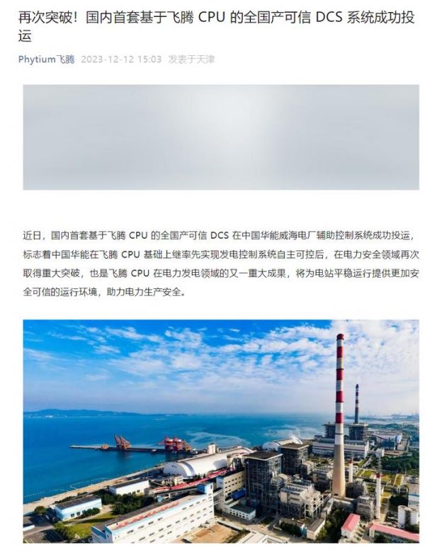 IT之家 12 月 12 日消息,Phytium 飞腾公众号发文宣布,国内首套基于飞腾 CPU 的全国产可信 DCS 在中国华能威海电厂辅助控制系统成功投运。