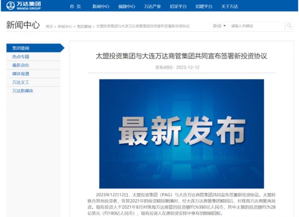 《每日经济新闻》记者从万达集团官网获悉,12月12日,太盟投资集团(PAG)与大连万达商管集团(以下简称万达商管)共同宣布签署新投资协议。太盟投资集团将联合其他投资者,在其2021年的投资赎回期满时,经万达商管赎回后,对珠海万达商业管理集团(以下简称珠海万达商管)再投资。