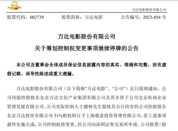 12月6日,万达电影再次公告,实际控制人王健林拟将其持有的北京万达投资有限公司51%股权转让予上海儒意。