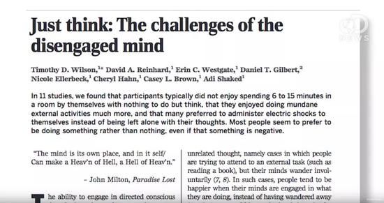 这个事实证明来自这样一个实验——2014年,美国维吉尼亚大学的研究者要求一群实验参与者一个人待在房间里6到15分钟,什么都不做,试着“用自己的想法娱乐自己”,然后问他们这短短的一段时间里的感受如何,是否过得还开心。