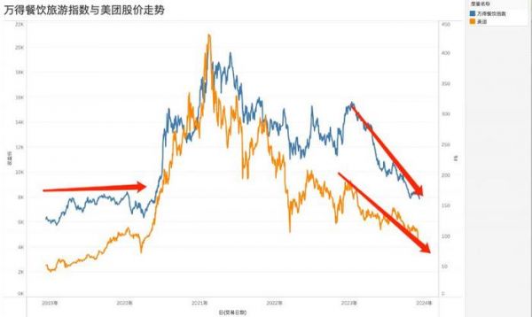 尽管身处A股的万得餐饮旅游指数与美团不在同一市场,但两条曲线仍然呈高度的一致性,值得注意的是,前者2023年缩水接近一半,与美团的市值收缩也属同一水平。