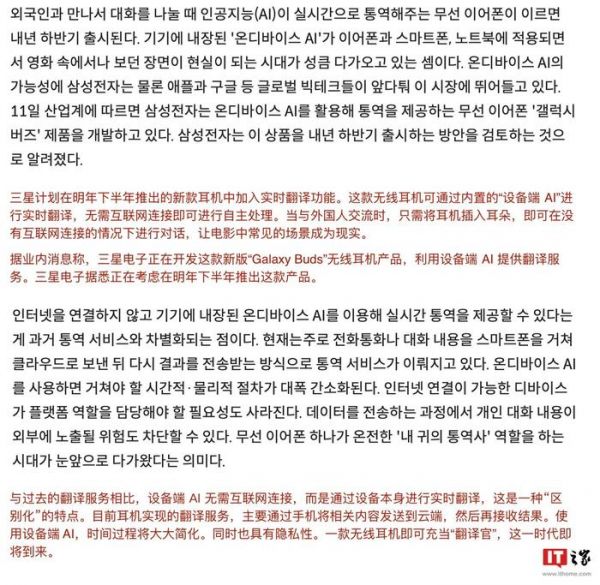 ▲ 图源 韩媒 Maekyung而基于设备端的 AI 无需互联网即可运行,因此在翻译等场景中,具备“本地化”及隐私优势,可以随时随地任意使用,无需考虑网络环境。