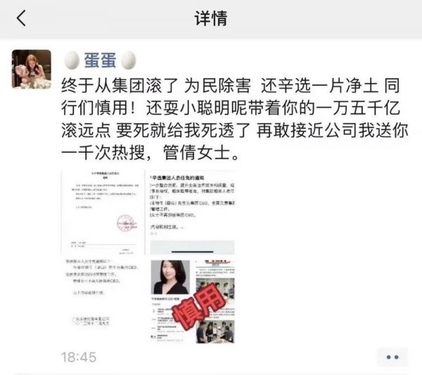 他担心管倩还将继续留在公司,无论以什么样的职位,但蛋蛋显然没有给管倩这样的机会,这位1997年生的更年轻的女士,在自己的朋友圈里再次对管倩“公开处刑”,“终于从集团滚了,为民除害,还辛选一片净土”,同时她还发布了人员任免通知,并建议“同行们慎用”。