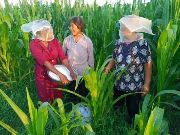 ▲布伦达(左一)与当地农户一起为玉米施肥。