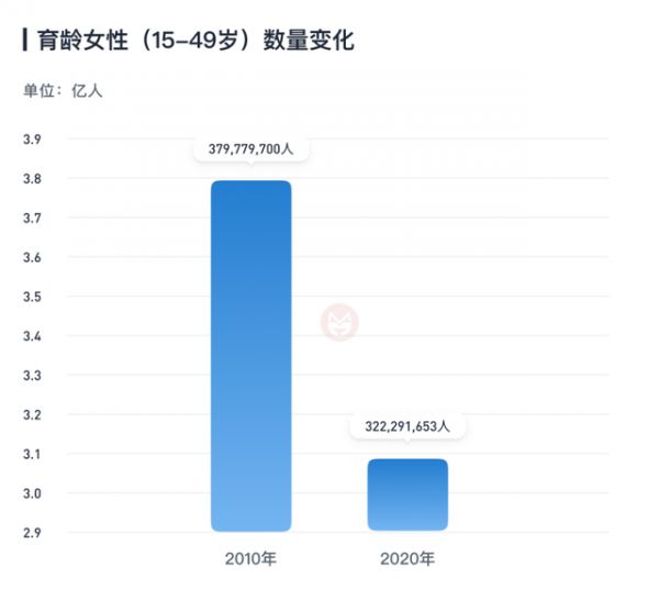 2010年,全国育龄女性约3.8亿,到了2020年仅3.2亿,10年间下降了15%。
