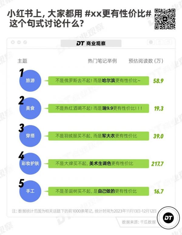 在小红书上,旅游是“XX更有性价比”这个句式里笔记数量最多的主题,超过美食、穿搭和彩妆护肤。