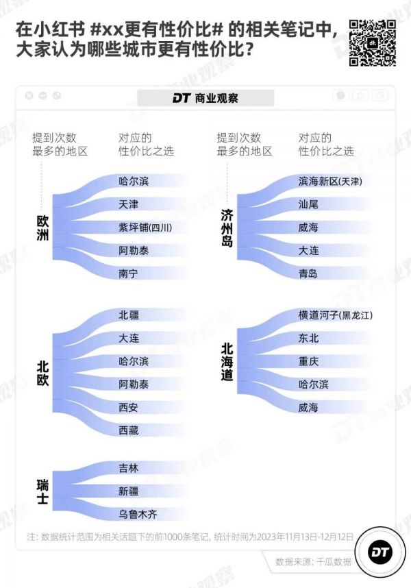 因此,人们在句式前面提到的地区,主要集中在国外,比如欧洲、济州岛、北欧、北海道和瑞士等,然后推荐具有相似的景色、建筑风格、特色项目等国内城市。