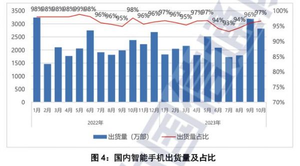2023 年 10 月,智能手机出货量 2818.1 万部,同比增长 18.5%,占同期手机出货量的 96.6%。