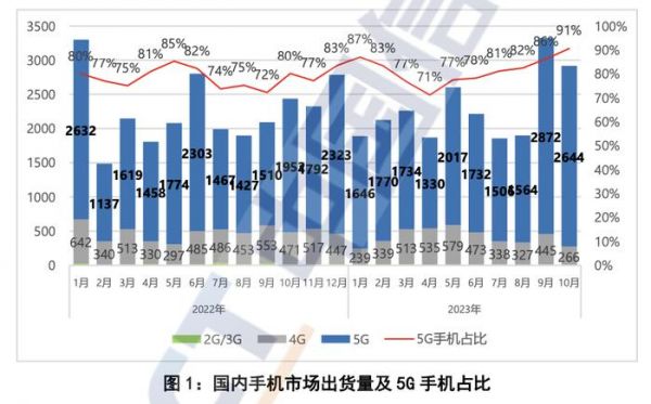 IT之家 12 月 13 日消息,中国信通院今日发布 2023 年 10 月国内手机市场运行分析报告,2023 年 10 月,国内市场手机出货量 2916.2 万部,同比增长 19.7%,其中 5G 手机 2643.5 万部,同比增长 35.5%,占同期手机出货量的 90.6%。