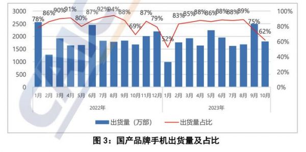2023 年 10 月,国产品牌手机出货量 1801.3 万部,同比增长 7.2%,占同期手机出货量的 61.8%; 上市新机型 49 款,同比增长 63.3%,占同期手机上市新机型数量的 98.0%。