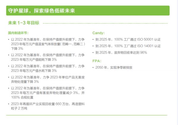 图:海尔智家的2023年期与2025年期环境目标,很清楚是在温室气体、能耗、水耗、废弃物、有害废弃物、塑料这6个因子上寻求改善。图片截取自:海尔智家2022年度ESG报告