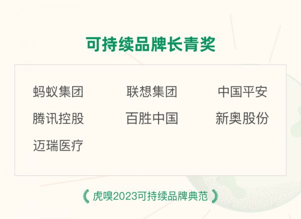此外,我们还选出了“可持续品牌长青奖”。获奖企业的可持续发展的主战略在2020年或更早就已经奠定,目前已经进入深度的量化执行阶段,在2023年,它们在一些重大的ESG领域在多年市场领先的基础上,依然维持高标准的治理或工作推进。