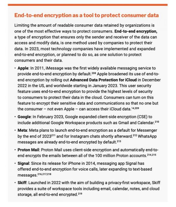 ▲ 图源 苹果安全部门发布的报告报告结论强调,企业部门应当采用“端到端加密”等保护措施,确保只有发送者和接受者可以获取并修改关键文件,从而应对日益严重的个人信息泄露。