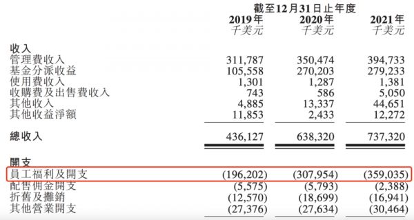 根据招股书,太盟投资在全球设立12个主要办事处,雇佣近600名员工,包括293名投资专业人员、68名投资支持专业人员等。2021年,太盟投资的员工福利及开支约3.59亿美元,人均收入高达59.8万美元,折合人民币约380万元。