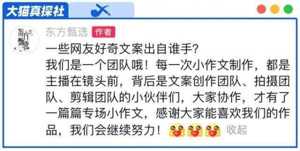 东方甄选在视频下评论,说,这是团队作战的结果,而且小作文背后是“文案创作团队”,本来这也没啥,但是在和网友互动中,话语你来我往,粉丝们读出了“看好了,这可不是董宇辉写的哦”的高傲感。